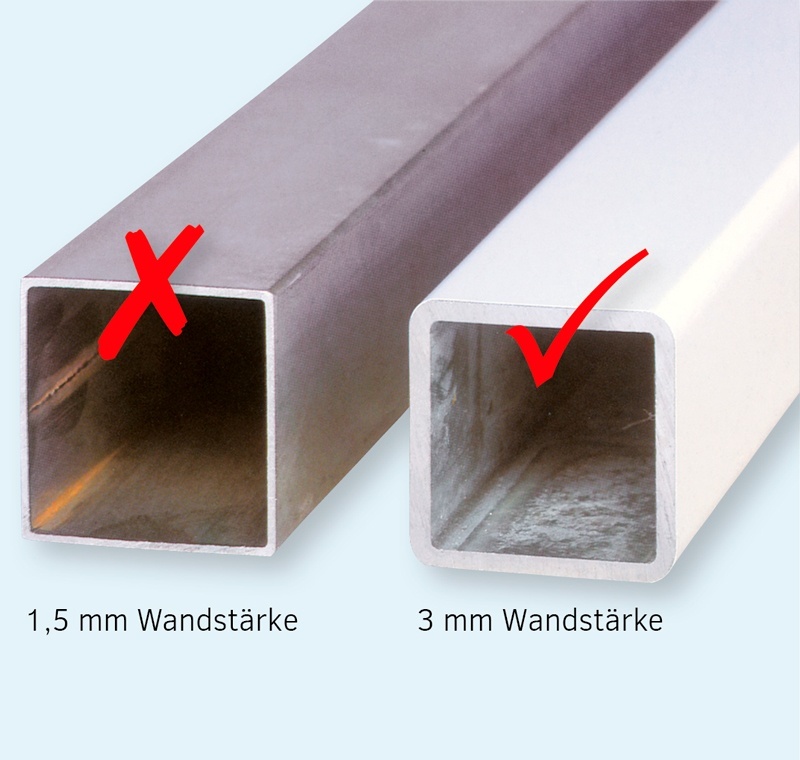 Die Wandstärke unserer Tragrohre haben bei uns durchgängig eine Wandstärke von 3 mm, sind senzimierverzinkt, pulverbeschichtet und selbst im Inneren mit einem Rostschutz ausgerüstet.