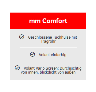 mm Markisen sind selbsttragende Tragrohr-Konstruktionen aus drei verschiedenen Längsprofilen: Dem Tragrohr, der Tuchwelle und einem Ausfallprofil.
